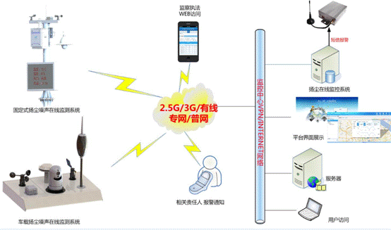 統(tǒng)由前端監(jiān)測設(shè)備、傳輸網(wǎng)絡(luò)和中心平臺三部分組成。前端監(jiān)測設(shè)備由車載式或固定式揚塵噪聲監(jiān)測儀組成。