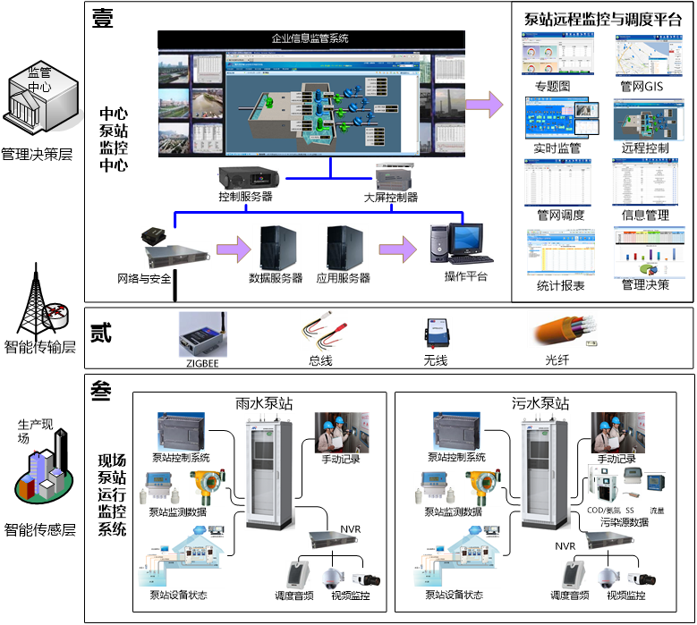 管網(wǎng)泵站遠程監(jiān)控與調(diào)度系統(tǒng)是通過在現(xiàn)場雨水與污水泵站建立自動控制、設(shè)備狀態(tài)監(jiān)控、視頻監(jiān)控、調(diào)度音頻等方面的綜合運行監(jiān)控系統(tǒng),并與中心運行與調(diào)度平臺實時對接,實現(xiàn)泵站運行監(jiān)控、遠程控制、綜合調(diào)度的等功能,為提高管網(wǎng)泵站運營管理效率,降低運行成本提供確實可行的科學手段。