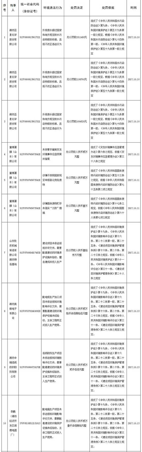 此外,山東中鐵華盛機械有限公司因需要配套建設(shè)的環(huán)境保護設(shè)施未驗收,主體工程投入生產(chǎn),違反了《建設(shè)項目環(huán)境保護管理條例》第二十條、二十一條、第二十三條之規(guī)定。企業(yè)被責令停止生產(chǎn),并罰人民幣伍萬元整。濰坊天一環(huán)保科技有限公司因未依法報批環(huán)評文件,需要配套建設(shè)的環(huán)境保護設(shè)施未驗收,擅自建成并投入生產(chǎn),違反了《中華人民共和國環(huán)境保護法》第十九條、《中華人民共和國環(huán)境影響評價法》第十六條、第二十二條第一款、第二十五條、《建設(shè)富維薄膜(山東)有限公司因未按要求編制突發(fā)環(huán)境事件應(yīng)急預(yù)案并備案處以罰款人民幣貳萬元整、涉嫌不按照國家規(guī)定申報登記危險廢物處以罰款人民幣貳萬元整、涉嫌固體廢物貯存未落實“三防”措施處以罰款人民幣壹萬元整;山東秋辰機械制造有限公司濰坊鑄造基地因建設(shè)項目未依法報批環(huán)評文件,需要配套建設(shè)的環(huán)境保護設(shè)施未驗收,擅自建成并投入生產(chǎn),處以罰款人民幣壹拾叁萬元整;濰坊奧維電子有限公司因配電柜生產(chǎn)加工項目未依法報批環(huán)境影響評價文件,需要配套建設(shè)的環(huán)境保護設(shè)施未經(jīng)驗收,主體工程即正式投入生產(chǎn)使用,處以罰款人民幣貳萬陸仟柒佰捌拾伍元整;濰坊中瑞造紙紡織助劑有限公司因造紙助劑生產(chǎn)項目未依法報批環(huán)境影響評價文件,需要配套建設(shè)的環(huán)境保護設(shè)施未經(jīng)驗收,主體工程即正式投入生產(chǎn)使用,處以罰款人民幣貳萬貳仟伍佰元整;李鵬(濰坊經(jīng)濟開發(fā)區(qū)潤德電器廠)因配電箱生產(chǎn)項目未依法報批環(huán)境影響評價文件,需要配套建設(shè)的環(huán)境保護設(shè)施未經(jīng)驗收,主體工程即正式投入生產(chǎn)使用,處以罰款人民幣貳萬壹仟柒佰捌拾元整;濰坊紅柳機械開發(fā)有限公司因拖拉機組裝項目未依法報批環(huán)境影響評價文件,需要配套建設(shè)的環(huán)境保護設(shè)施未經(jīng)驗收,主體工程即正式投入生產(chǎn)使用,處以罰款人民幣叁萬壹仟貳佰元整;壽光福麥斯輪胎有限公司因排放大氣污染物超過國家和地方規(guī)定的排放標準,處以罰款人民幣壹拾萬元整。