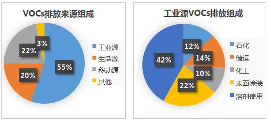 工業(yè)源VOCs排放涉及的行業(yè)眾多,比重高達55.5%,工業(yè)源中的重點工業(yè)行業(yè)包括石油煉制和儲運、化工、溶劑使用(包括表面涂裝)等。溶劑使用產(chǎn)生的VOCs排放量占總排放量23.3%。紡織印染行業(yè)在生產(chǎn)過程中使用大量的有機溶劑,是工業(yè)源VOCs排放的重要組成,其VOCs排放量約占總排放量的2.8%。(數(shù)據(jù)來源:揮發(fā)性有機物(VOCs)污染防治技術(shù)政策征求意見稿編制說明)
