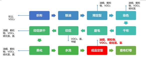 紡織印染生產(chǎn)工藝流程大致分為布準備及前處理、染色、印花、后整理及成品包裝四個階段。由于加工布料的差異,工藝稍有不同,往往需要多種原料,通過多個組合工序進行生產(chǎn),VOCs排放幾乎涉及了所有的排放環(huán)節(jié)。成品定型階段是防治印染行業(yè)排放量最大的加工環(huán)節(jié),其排放來源于使用高溫定型機導(dǎo)致的溶劑揮發(fā)