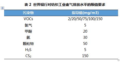 國際上,不同國家、不同地區(qū)針對紡織工業(yè)大氣排放標準有不同的約束條件。其中,世界銀行的《防治印染行業(yè)廢氣排放水平標準》列出了揮發(fā)性有機物VOCs)、氯氣、甲醛、顆粒物等主要污染因子的限值,這與我國紡織工業(yè)廢氣排放種類基本相同,可作為紡織印染行業(yè)的重要技術(shù)參考。