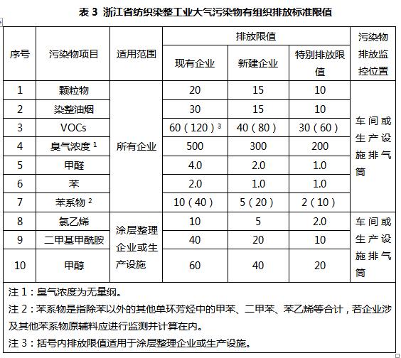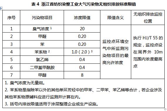目前我國印染行業(yè)大氣污染物排放標準正在制定,國內(nèi)只有浙江省頒布了《浙江省紡織染整工業(yè)大氣污染物排放標準》(DB33/962-2015),其他省份地區(qū)目前仍在執(zhí)行《大氣污染物綜合排放標準》或當(dāng)?shù)氐拇髿馕廴揪C合排放標準。